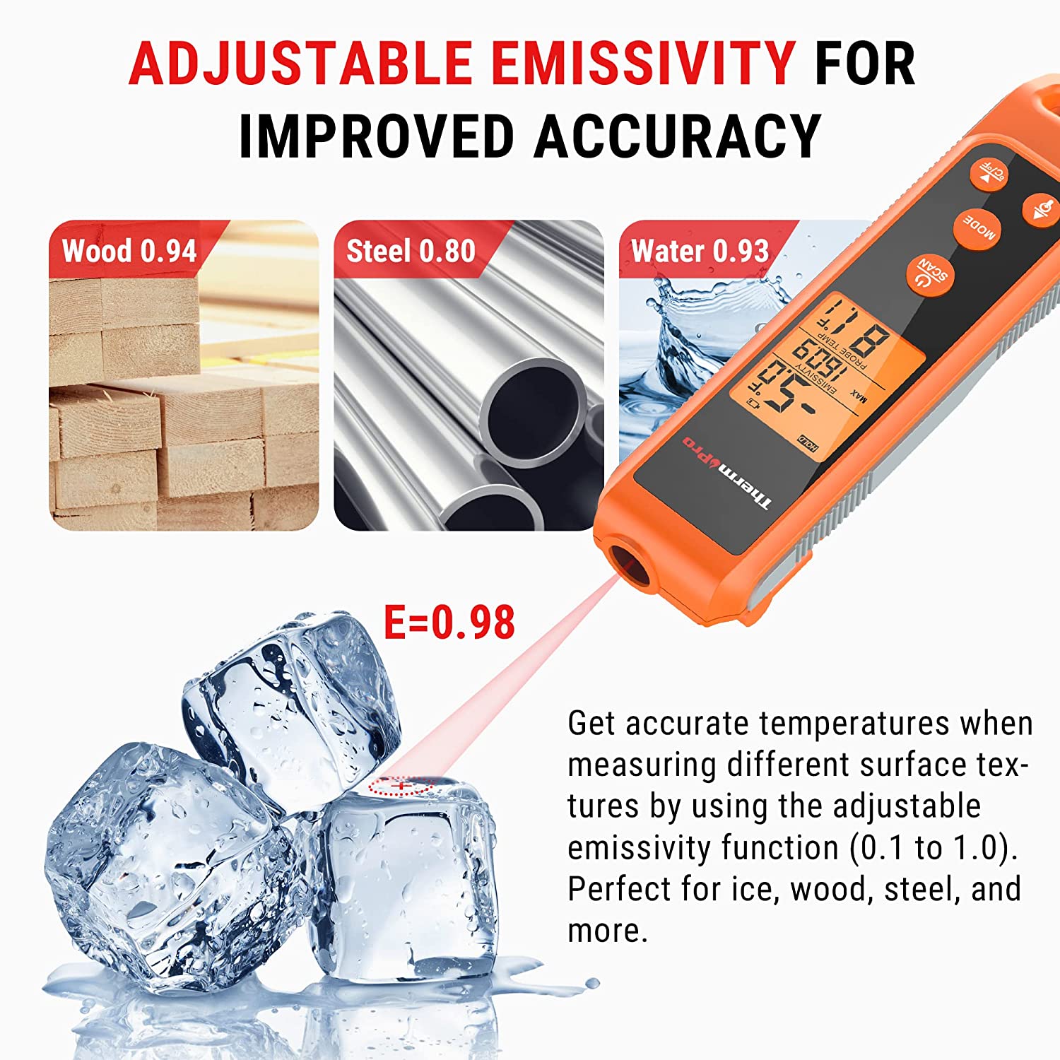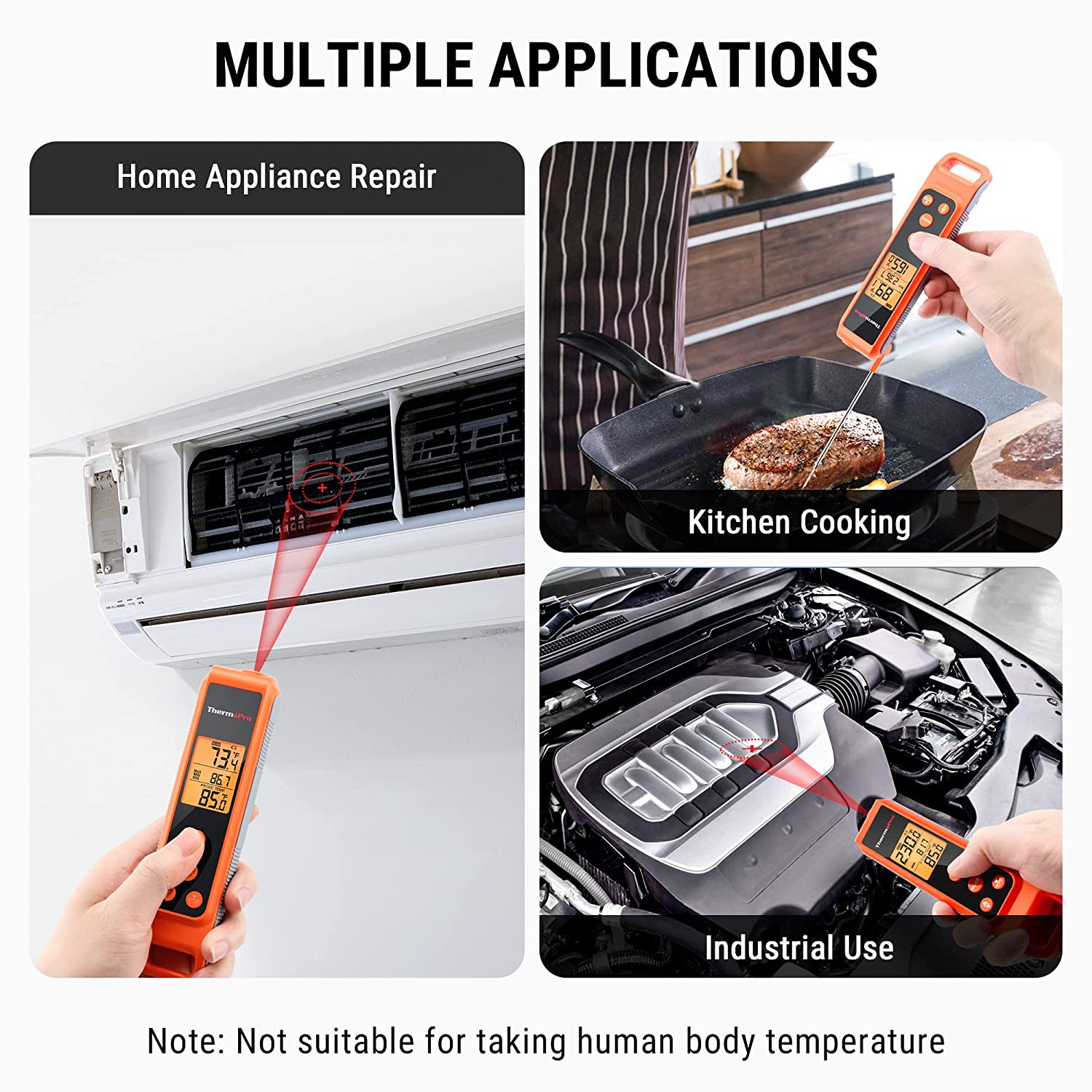 - Various Application : Featuring an adjustable emissivity from 0.1-1.0 and recommended doneness levels imprinted on the back, this instant read meat thermometer can be used to check the heat of your griddle, manage home HVAC operations and auto repairs, making it perfect for any of your daily tasks