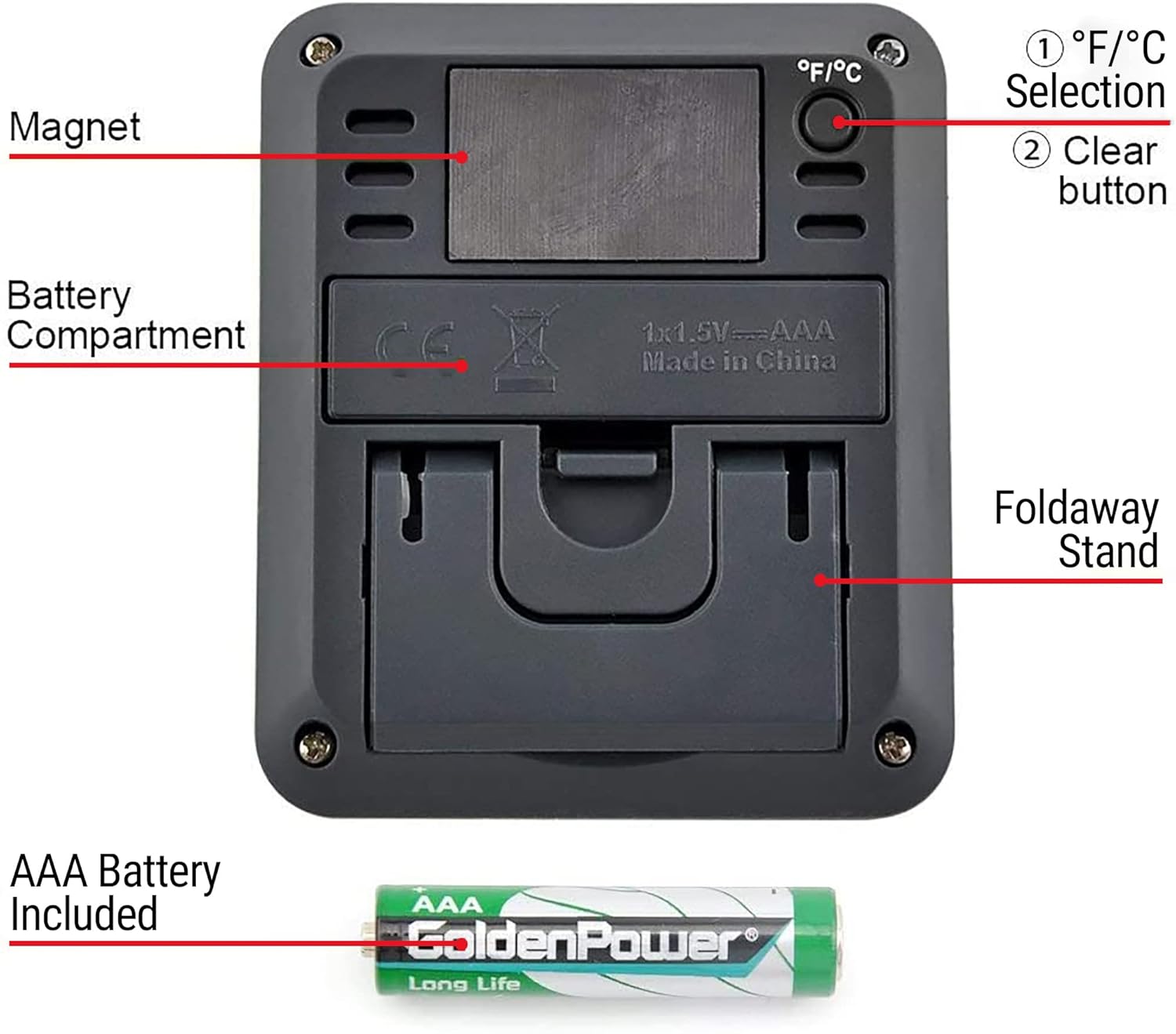 - Smart Design: Indoor room thermometer features a tabletop stand to place the temperature monitor on your counter or use the magnetic back to attach to a fridge; °F/°C Selector; Powered by 1 x AAA battery (included)