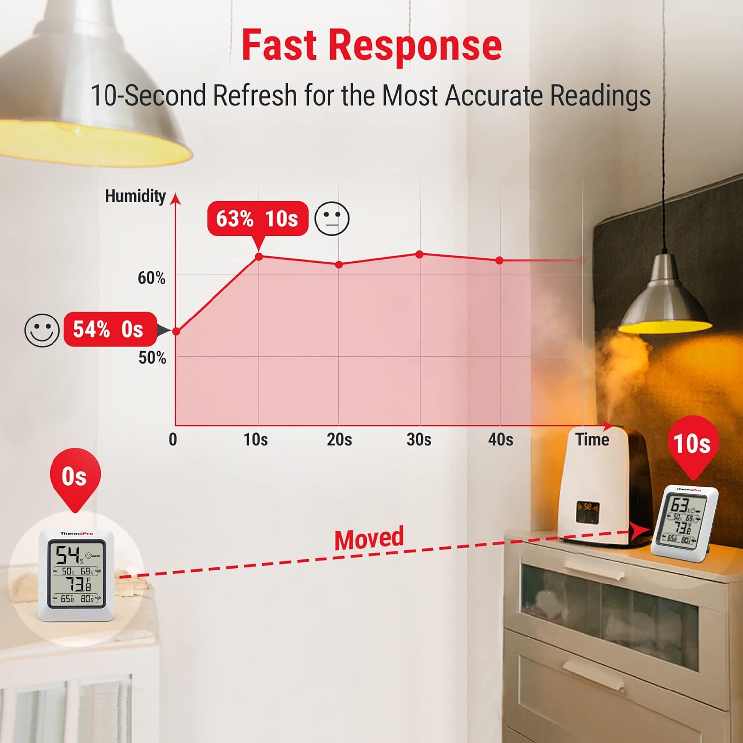 - Air Comfort Indicator: Humidity meter with humidity level icon indicates air condition -- DRY/COMFORT/WET, allowing this humidity sensor to ensure you’re always aware of changes to your home/household with just a quick glance