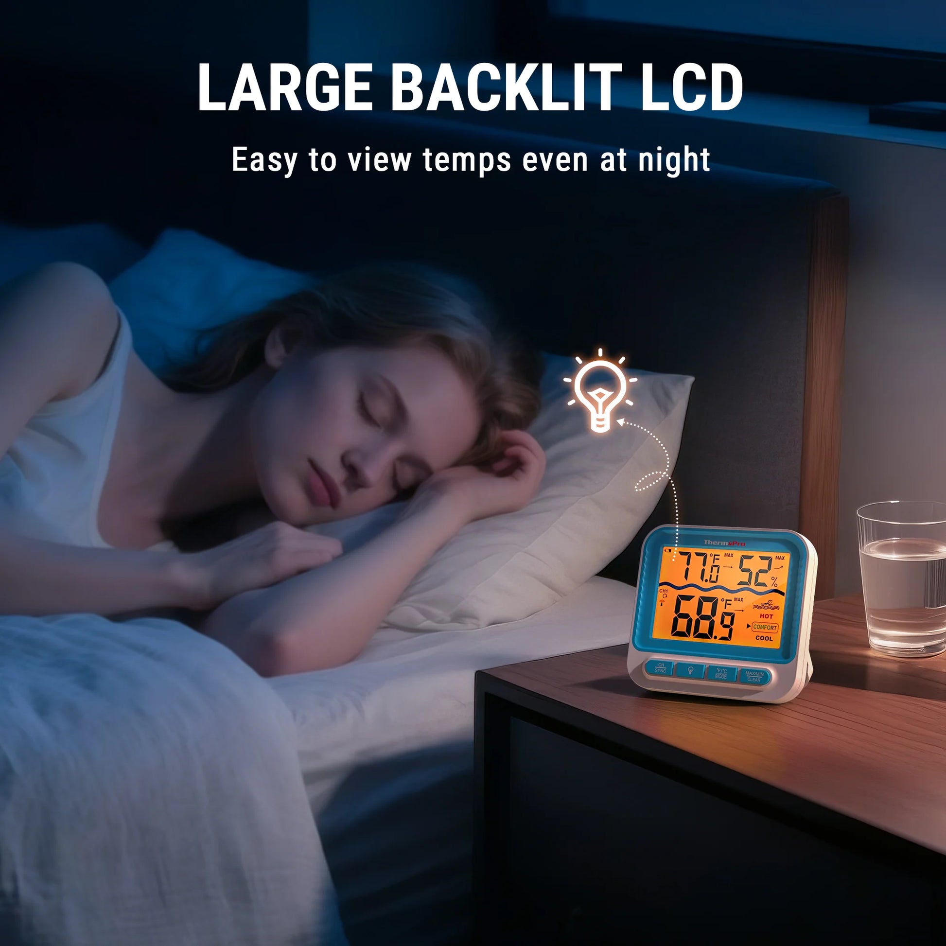 Large Backlit Display: Backlit screen with large digits ensures easy reading even in low-light conditions. The all-time/24-hour maximum & minimum temperature records help you track changes throughout the day.